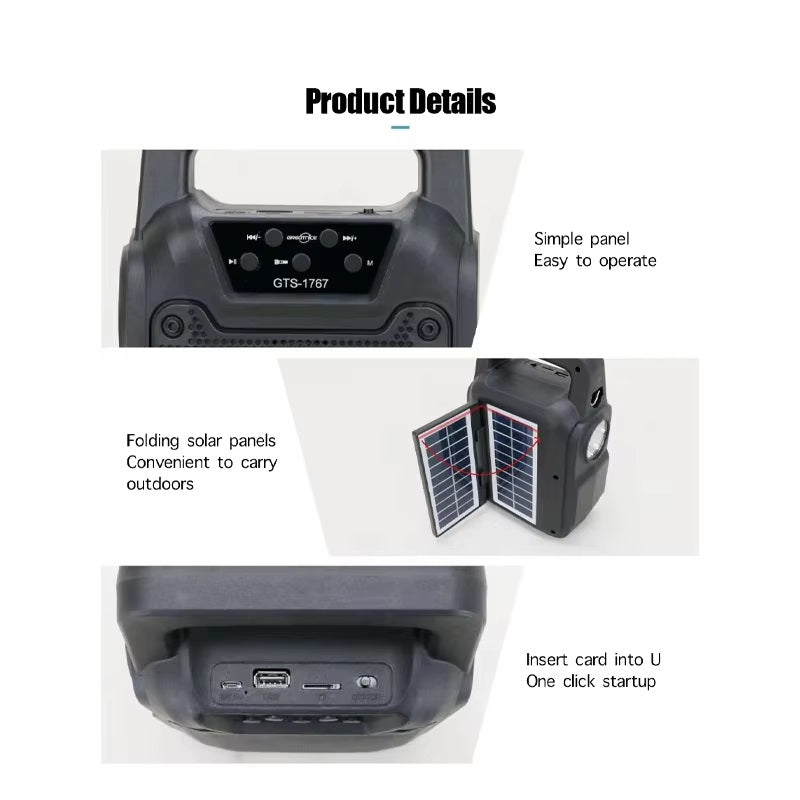 Featuring advanced Bluetooth wireless connectivity, the GTS-1767 pairs easily with smartphones, tablets, and other Bluetooth-enabled devices for smooth and stable music streaming. The solar charging feature allows you to recharge the speaker using sunlight, while the rechargeable battery ensures reliable performance anytime.