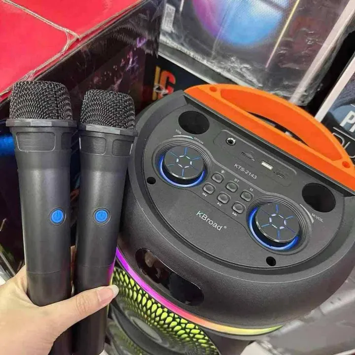 This is a KTS-2143 portable Bluetooth speaker with two wireless microphones.